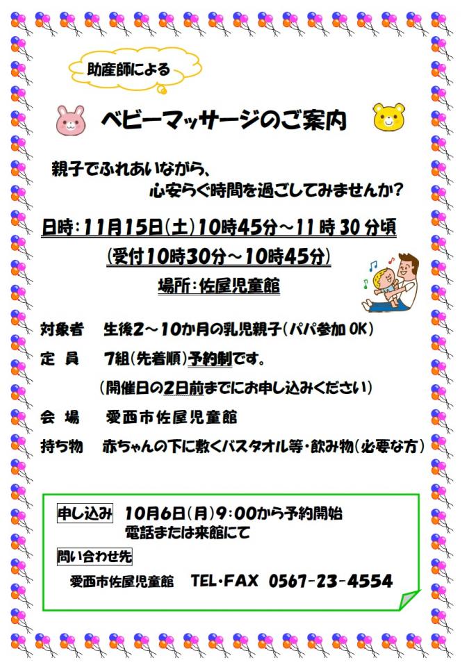 「ベビーマッサージ」のおしらせ
